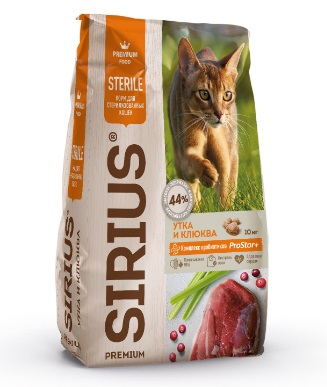 SIRIUS - сухой корм премиум класса для полноценного ежедневного рациона стерилизованных кошек. Высокое содержание мясных ингредиентов обеспечивает оптимальный уровень белка и укрепляет мышцы. Пониженное содержание жиров для контроля веса. Баланс витаминов и комплекса пробиотиков 4-го поколения PROSTOR+ нормализует пищеварение и укрепляет иммунитет. Омега 3 и Омега 6 способствуют поддержанию здоровья сердца, мозга, нервной системы, здоровья кожи и красоты шерсти. Корм способствует профилактике мочекаменной болезни.