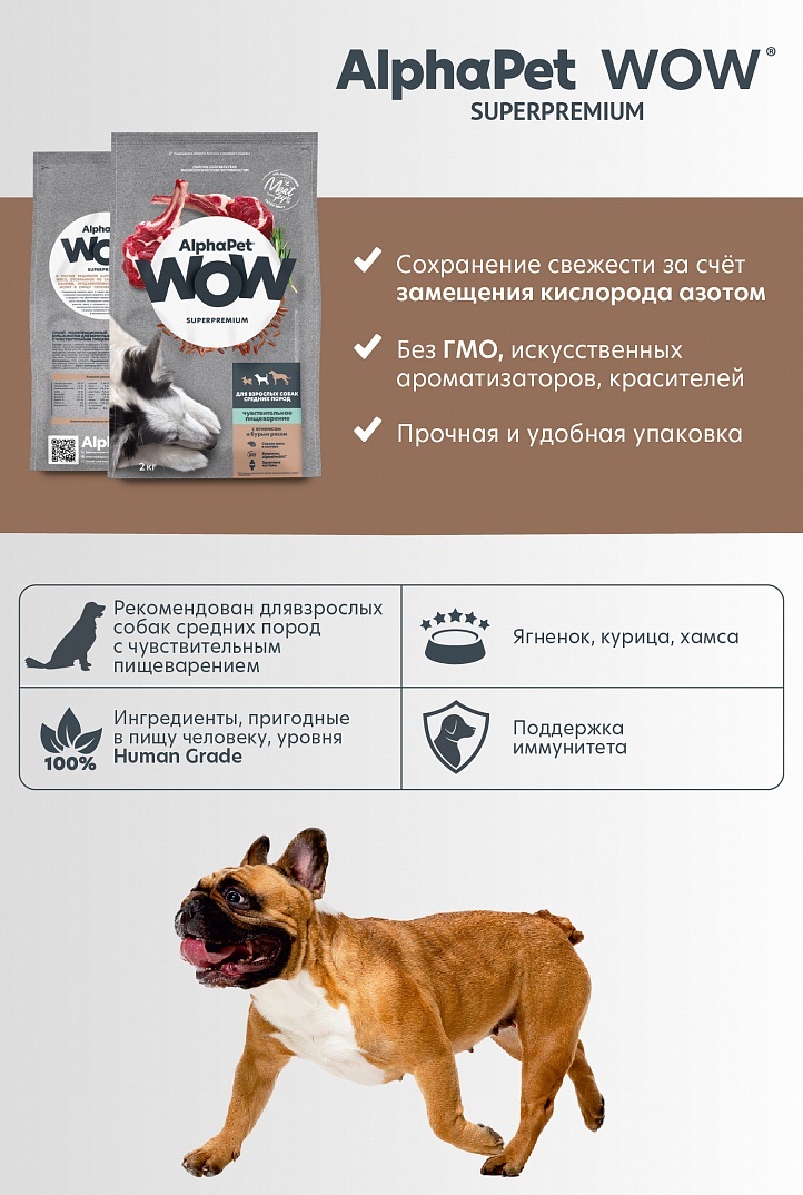 AlphaPet WOW SuperPremium сухой ГИПОАЛЛЕРГЕННЫЙ корм для собак Средних и Крупных пород с чувствительным пищеварением (Ягненок и бурый рис)